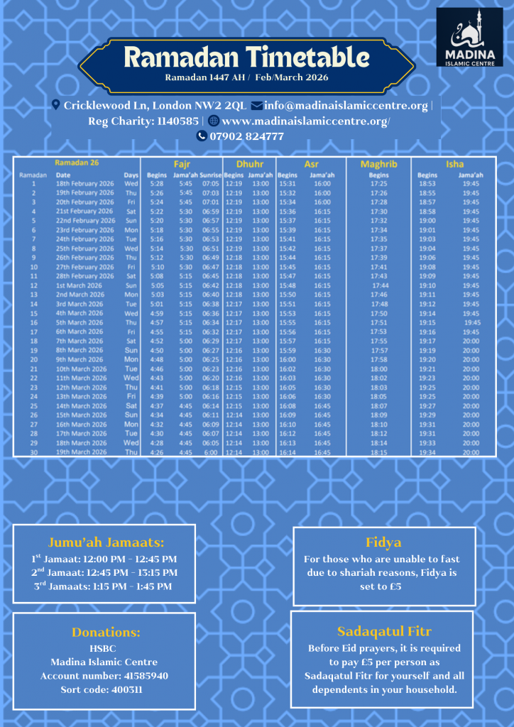 Whether you’re coming for prayer, seeking knowledge, or looking to be part of a vibrant and supportive community, Madina Islamic Centre welcomes you with open arms. 📍 Visit us in Cricklewood, London (NW2 2QH) 🕋 Stay updated with prayer times and events on our website. 📲 Download our app and follow us on social media to stay connected.Surah At-Tawbah (9:18):